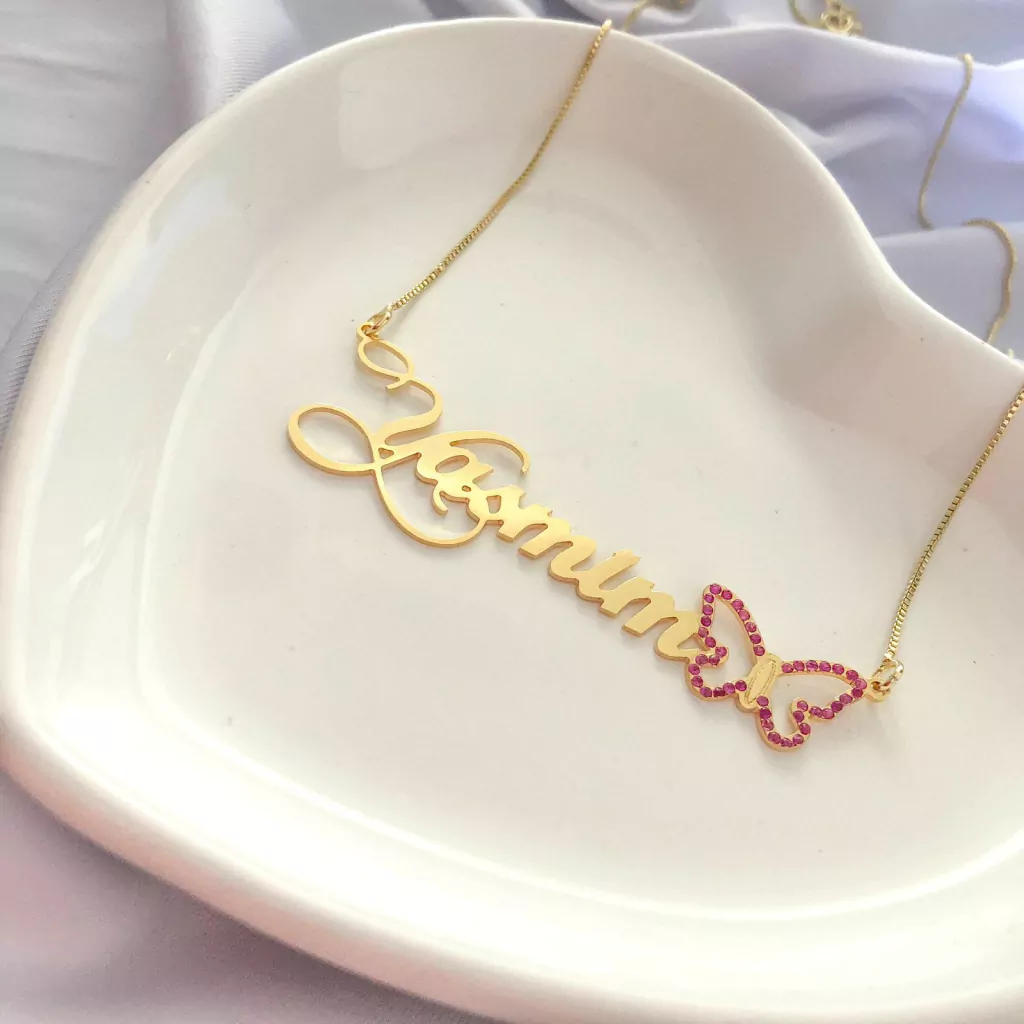 Colar com nome personalizado e com um lindo acessório de borboleta com pedras de zircônias rosas