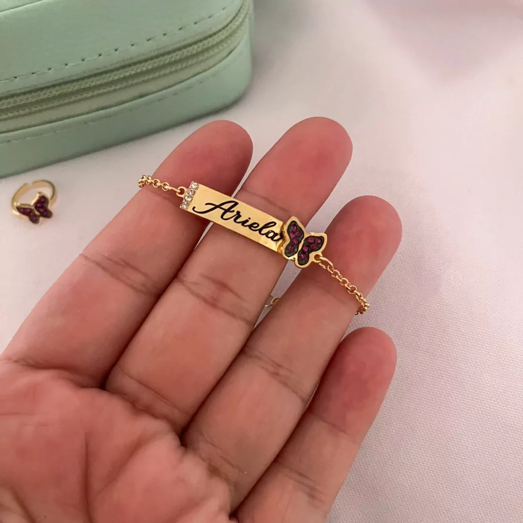 Encante os pequenos com nosso Conjunto Infantil de pulseira e anel personalizado com nome de sua pequena , com uma linda borboletinha em pedrinhas rosa. Cada peça foi cuidadosamente projetada para dar a impressão de movimento, fazendo com que as borboletas pareçam estar prestes a voar. Seja para festas, eventos especiais ou o dia a dia, nossos conjuntos são a escolha perfeita para um toque de brilho e encanto. Deixe suas pequenas brilharem com estilo e delicadeza.